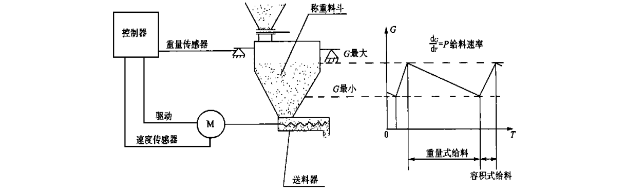 控制器將I作為反饋量與設(shè)定的送料速度P進(jìn)行比較,調(diào)整送料器的送料速度,使送料速度接近和等于設(shè)定速度。當(dāng)料斗內(nèi)的料”下降到低料位時(shí),控制系統(tǒng)自動(dòng)將加料閥門打開,當(dāng)?shù)竭_(dá)高料位時(shí)閥門被關(guān)閉,加料時(shí)間只需幾秒。在加料期間,送料器的速度不變,因而對(duì)送料精度影響極微。